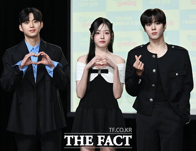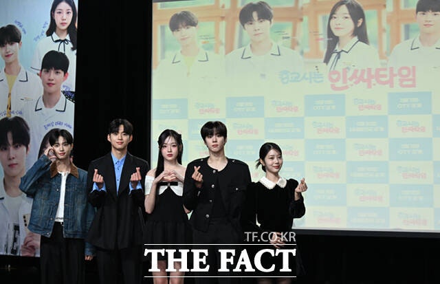 배우 최건과 강나언, 김우석 (왼쪽부터)이 29일 서울 강남구 일지아트홀에서 열린 웹드라마 '0교시는 인싸타임' 제작발표회에 참석해 포즈를 취하고 있다.배우 손동표와 최건, 강나언, 배하늘 감독, 김우석, 한채린(왼쪽부터)이 29일 서울 강남구 일지아트홀에서 열린 웹드라마 '0교시는 인싸타임' 제작발표회에 참석해 포즈를 취하고 있다.