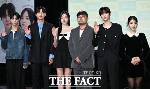 배우 손동표와 최건, 강나언, 배하늘 감독, 김우석, 한채린(왼쪽부터)이 29일 서울 강남구 일지아트홀에서 열린 웹드라마 '0교시는 인싸타임' 제작발표회에 참석해 포즈를 취하고 있다. /이새롬 기자
