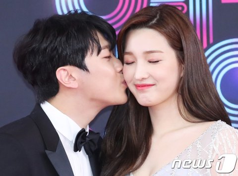 최민환, 율희 부부가 22일 서울 영등포구 여의도동 KBS 본관 시청자광장에서 열린 '2018 KBS 연예대상' 레드카펫 행사에 참석해 포즈를 취하고 있다. 2018.12.22/뉴스1 ⓒ News1 권현진 기자