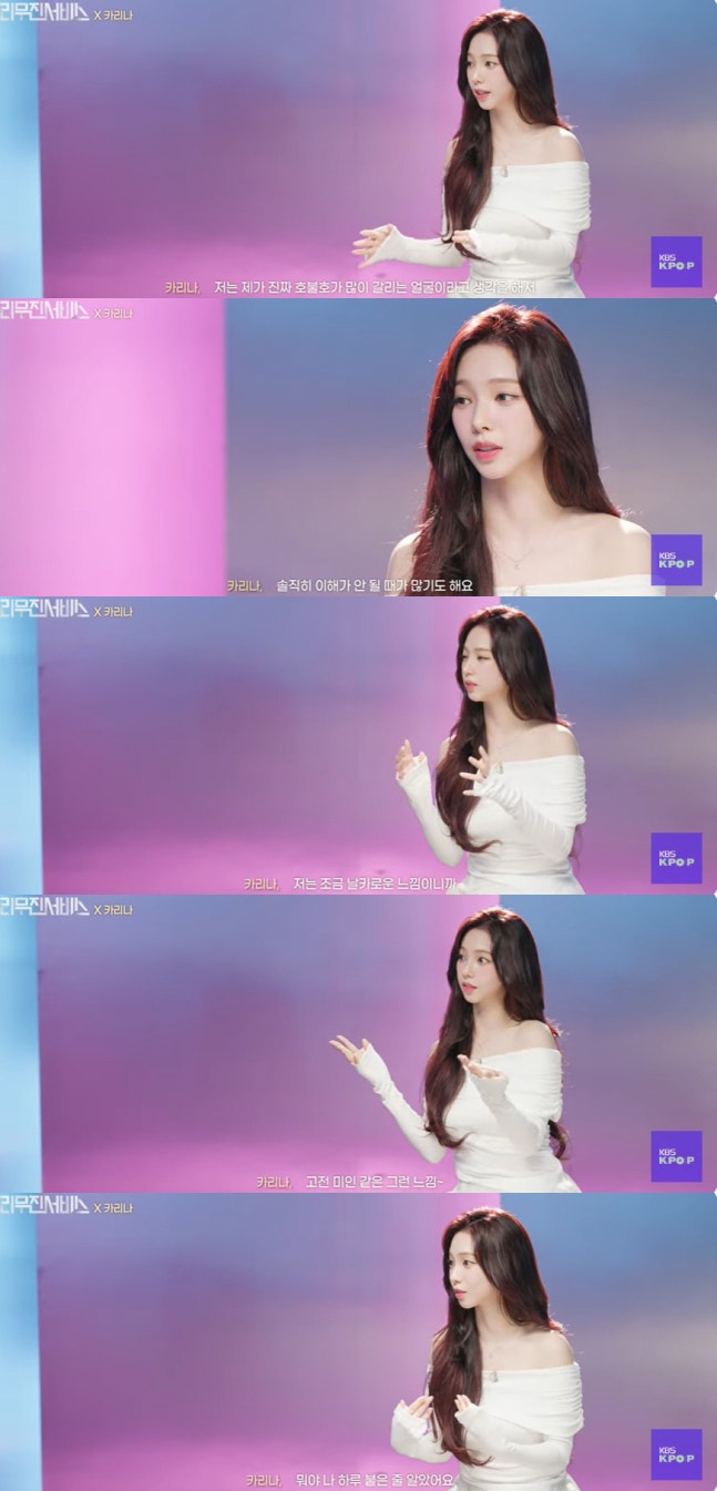 이에 카리나는 "저 엄청 많이 한다. 저는 제가 진짜 호불호가 많이 갈리는 얼굴이라 생각한다. 예쁘다고 해주시는 건 너무 감사하지만 이해가 안 될 때가 많기도 하다"고 밝혔다.