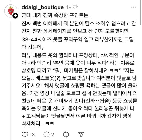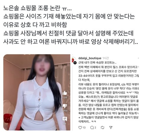 쇼핑몰 사장은 얼마나 속상했으면… 자기가 열심히 만든옷 조롱하는 영상에다가 조롱하는 댓글에 하트까지 누르더니 사과 안하고 튀는 모습 보면 난 저걸로 안 끝낼듯