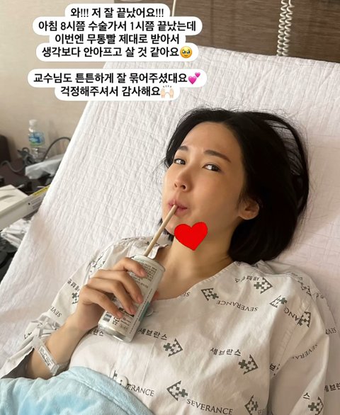 초아는 지난 25일 자신의 개인 소셜미디어 계정을 통해 "저 퇴원했어요!!! 수술도 잘됐고 컨디션도 너무 좋아서 교수님께서 집에 가라고...ㅋㅋㅋ 후기 보고 걱정이 많았는데 다행이에여ㅎㅎ 아직 가스통 땜에 겨우 걷고 있지만 이제 집에서 잘 회복해 볼게요! 걱정해주셔서 감사합니다. 엄마가 되기 위한 또 한걸음 완료"라는 글과 함께 병원 생활기 여러 장을 업로드 했다.