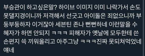 해원 편지 올린것도 짜치는게, 오해원 아무 잘못 없는거 합퀴들 빼고 다 아는 사실인데 이번 사태 후에 받은 편지도 아니고 예전에 받은 편지 굳이 지금 올려서 "부승관이 오해원 편 들어준다" 이런 기사 나오는거 ㅈㄴ속보임