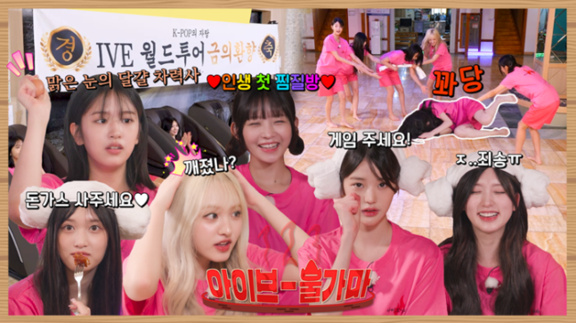 식사를 마치고 아이브 멤버들은 게임에 나섰다. 갑자기 등장한 지압판에 발을 올려보며 “아파서 서 있을 수가 없다”고 걱정했지만 장원영은 지압판 위를 미동도 없이 걸어가는 모습을 보여 모두의 놀라움을 샀다. 예상대로 지압판 게임의 최종 승자는 장원영이었고, 선물 증정식으로 찜질방에서의 알찬 하루를 마무리했다.