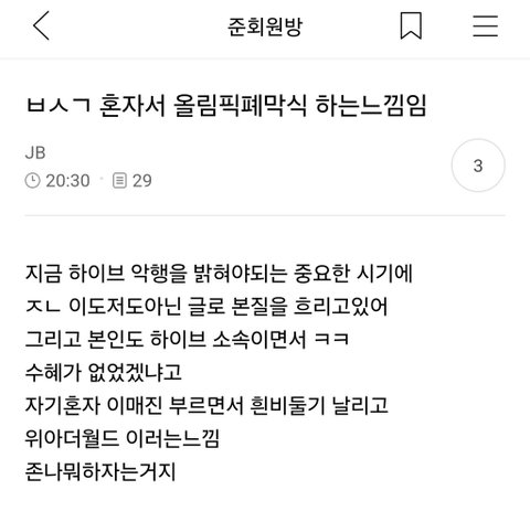 이때싶 억까네. 누가봐도 하이브가 여러아이돌 공격한거 때문에 화가나서 아이돌무시하지말라고 쓴걸가지고 왜 뭐라하는거임? 하이브도 개역겨운데 뇌가 있으면 민희진도 역겨운게 정상임. 보고서만 더럽고 민희진 아이돌 비방 욕설 카톡,기자회견은 괜찮음? 소녀시대 드림콘서트때 따돌리던 때랑 다른게없냐 참 릇저씨나 버니즈나 개극혐이야.