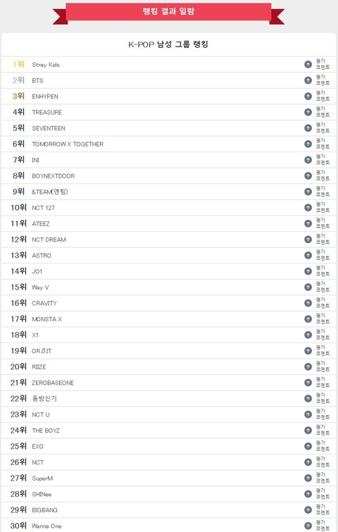 2024년 일본 10대 남녀가 투표한 가장 좋아하는 케이팝 남성그룹 순위