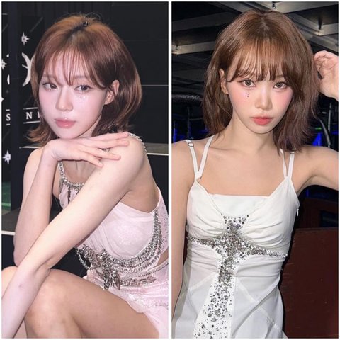 갈색 레이어드 단발컷, 가운데에 반짝이 있는 원피스 의상, 한쪽 눈 밑에 큐빅 붙여놓은거까지 그대로 복붙한거ㅋㅋㅋ 심지어 이게 같은 년도 8월 콘서트 오프닝 헤메코임ㅋㅋㅋ