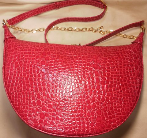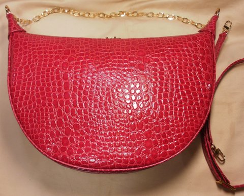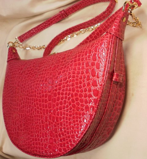 레드 컬러 에나멜 코팅 된 자갈 무늬 엠보싱 천연가죽으로 제작한 숄더백입니다.(마디샤가죽공예)