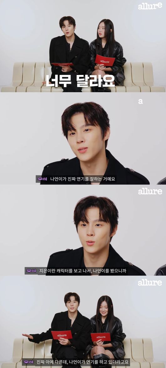 특히 김우석은 "아까 첫인상 이야기해서 생각난 건데 지은이란 캐릭터를 보고나서 나언이를 봤으니까 비슷한 성격인줄 알았는데 아예 다른 사람인데 연기를 하고 있더라"며 "일단 말투부터가 다르다. 캐릭터 지은이는 애교가 되게 많은데 나언이는 T다. T적 모먼트가 상당하다"고 말했다.