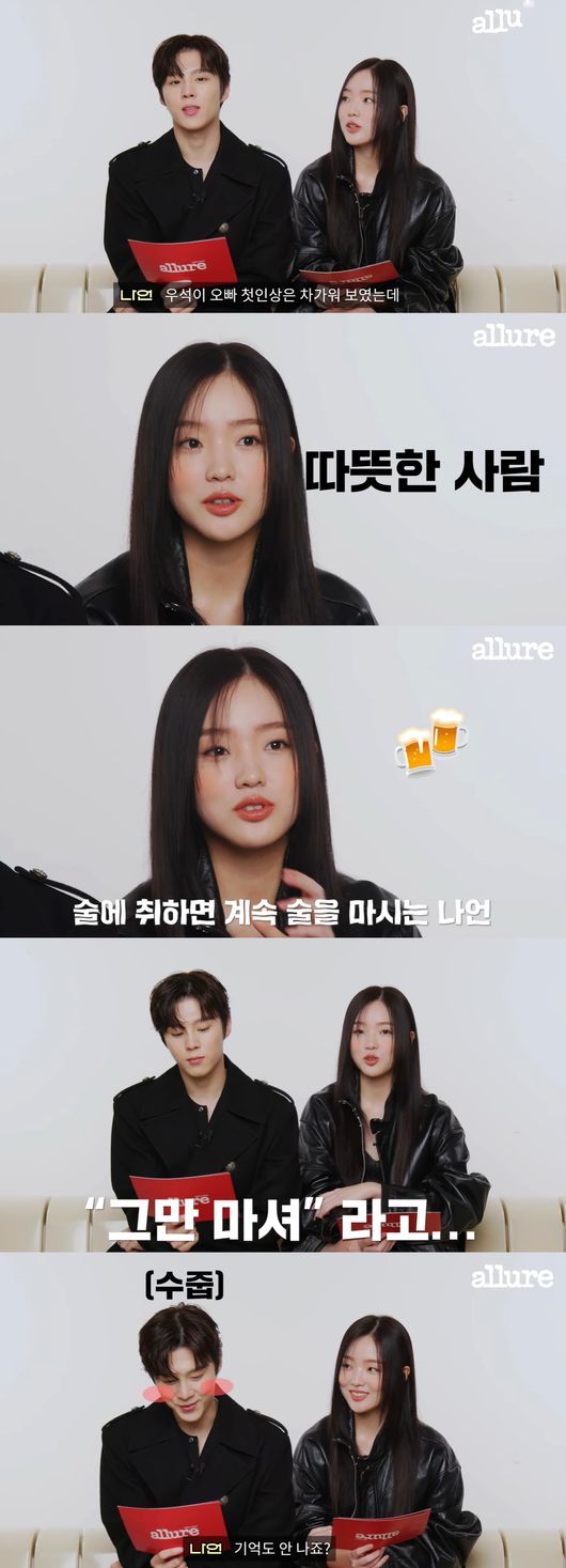 서로의 첫인상과 현인상을 묻자, 강나언은 "첫인상은 차가워보였는데 촬영 같이 하면서 친해지고 가까워지니까, 따뜻한 모습을 많이 봤고 속이 되게 깊은 사람이라고 느꼈다"며 "드라마 쫑파티 때 일화가 있다. 내가 취하면 계속 술을 마시는 주사가 있는데 내가 취한 것 같으니까 오빠가 '그만 마셔'라고 해주더라. 그런 점이 좀 다정하지 않았나 싶다. 기억도 안 나지?"라며 애교 섞인 눈빛으로 김우석을 바라봤다.