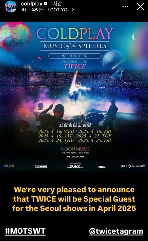 이번에 콜드플레이 월드투어에 스페셜 게스트로 나옴...