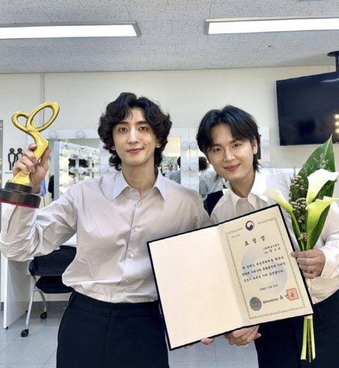 공개된 사진 속 최정훈은 같은 멤버 김도형과 함께 수상 기쁨을 만끽하고 있는 모습. 트로피, 표창장, 꽃다발을 들고 환하게 미소 짓고 있다.