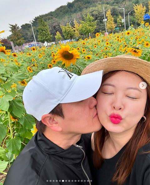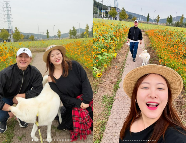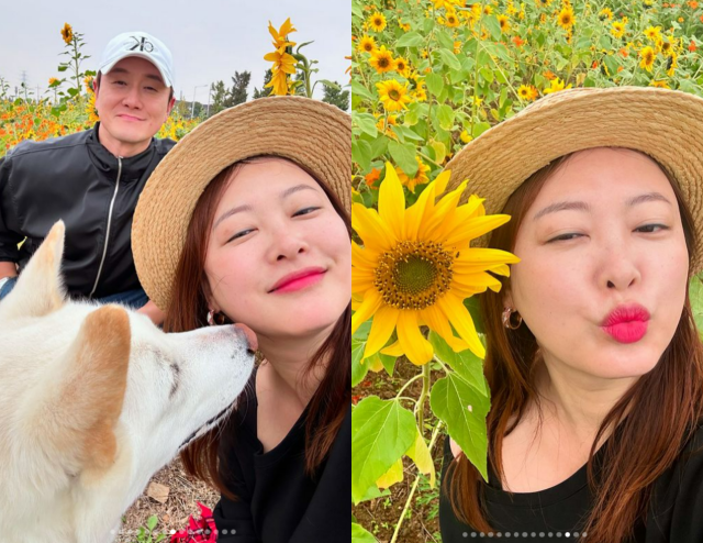 사진 속 심진화는 김원효, 반려견과 함께 꽃구경에 나섰다. 심진화는 해바라기가 가득 핀 곳을 거닐며 사진을 남겼다.