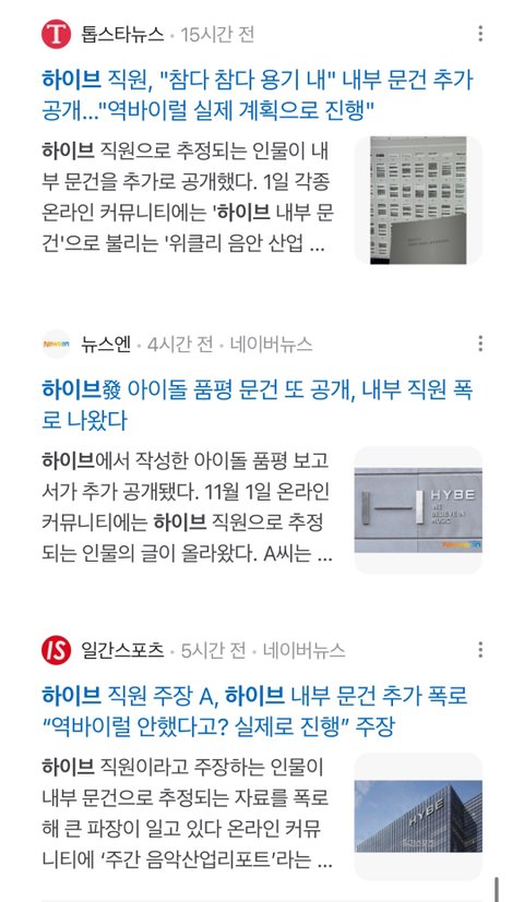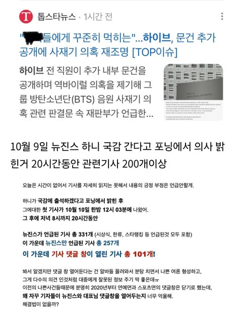하이브 언론 장악 진짜 개 너무함 ㅠ 어찌 보면 1위 엔터회사가 언론 꽉 잡고 있는 거 뻔하긴 한데, 그래도 대기업의 추한 보고서가 국감 이후로 까발려졌는데 한 언론사 당 최소 1개는 써야한다고 보는데 ㅡ;; ㅈㄴ 외국인 하니한테만 저러노 개 약았다