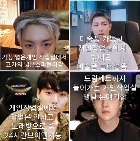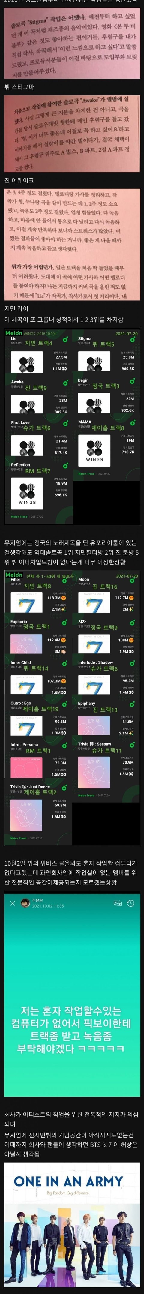 작업실 있는 멤들을 탓하는 건 절대 아님. 이런 대우 받고 있는데 방시혁 최애멤이라는 둥 니새끼는 차별받고 있다 이런 말들 하는 거 그만 좀 하라고 쓴 글임. 적당히 좀 하라고