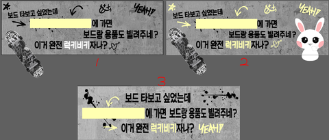 벽에 낙서한듯한 느낌을 주고싶은거 같은데 몇가지 수정할거 정리해줄게. 1. 글자 크기에 차별점을 주기. 강조하고 싶은 단어에만 크기를 키우고 굵기를 줘봐 2. 강조 색깔 넣기 일단 회색 배경에 검정 글씨는 눈에 잘 들어오지도 않아 너가 멀리서봐도 그럴거야. 전체 글자색은 흰색으로 하되 물품대여가능 이런 중요문구에 강조색을 넣어봐 형광 스프레이색상으로 하면 벽에 칠한 느낌날지도 3. 가독성을 위해서 줄간격 띄우기. 만약 글자폰트가 20pt 라고 가정했을때 줄간격을 35~40px까지 떨어트려봐. 퍼센트를 넣을수 있다면 120%~150% 추천 4. 이미지를 넣고 싶으면 글자가 뭍히지 않을 사이즈로 조절하기 글자보다 이미지 색깔이 눈에띄고 너무 커서 문구가 안보여. 스티커 붙이듯이 붙여야지 대자보 붙이듯이 붙이지 말아봐. 깔끔하게 색깔있는 스티커는 떼고 선으로만 되어있는 이미지를 쓰는것도 낙서그림 같고 좋을거같아.