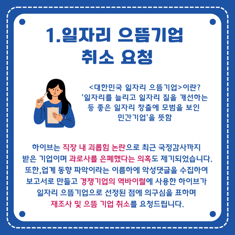 하이브의 일자리 으뜸기업 취소를 요청합니다.