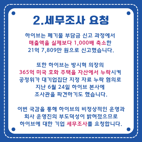 하이브는 최근 환경노동위원회 국정감사에서 연매출을 축소 신고해 플라스틱 폐기물 부담금을 절반만 부과했다는 사실이 밝혀졌습니다. 하이브는 폐기물 부담금 신고 과정에서 매출액을 실제보다 1,000배 축소한 21억 7,809만 원으로 신고했습니다. 지난 6월에는 대기업 집단 지정 시 방시혁의장의 365억 미국주택을 공시에서 누락하여 공정위가 조사관을 파견하기도 했습니다. 하지만 하이브는 매번 단순업무 실수라는 변명만 하고 있습니다. 대기업으로서 지켜야할 사회적 의무를 무시하고 주요자료를 반복적으로 누락시키는 하이브에 대해 기업 세무조사를 실시해주시기 바랍니다.