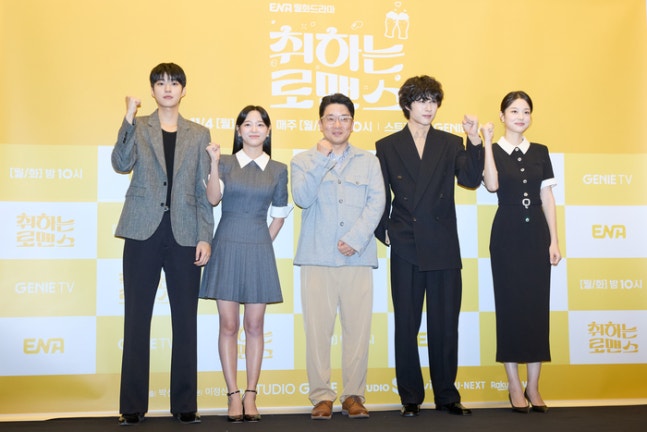 배우 백성철(왼쪽부터)과 김세정, 박선호 감독, 이종원, 신도현이 4일 오후 서울 상암동 스탠포드 호텔에서 열린 ENA 새 월화극 ‘취하는 로맨스’ 제작발표회에 참석해 포즈를 취하고 있다. 사진 스튜디오 지니그는 “그래서 연락을 해봤더니, 긍정적인 뉘앙스가 있었다. 그래서 ‘같이 하자’고 했다”고 전했다.