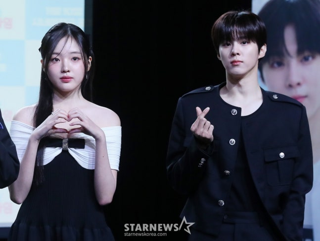 배우 강나언, 김우석이 29일 오전 서울 강남구 청담동 일지아트홀에서 진행된 웹드라마 '0교시는 인싸타임' 제작발표회에 참석해 포즈를 취하고 있다. '0교시는 인싸타임'은 익명 커뮤니티 앱 '인싸타임'의 관리자가 되어 전교생의 모든 비밀을 알게 된 '아싸'(아웃사이더)가 지독하게도 얽히고 싶었던 '핵인싸' 무리에 들어가며 펼쳐지는 하이틴 시크릿 로맨스다. 채널 시네마천국에서 오는 11월 10일 첫 방송된다. 2024.10.29 /사진=김창현 chmt@김우석과 강나언은 웹드라마 '0교시는 인싸타임'(극본 고이찬, 연출 배하늘)을 통해 인연을 맺고 연인으로 발전한 것으로 알려졌다.이와 관련해 지난달 25일 김우석 소속사 블리츠웨이스튜디오는 "김우석이 강나언과 작품 촬영 종료 후 조심스럽게 연인 관계로 발전한 것으로 확인했다"고 밝혔다. 이어 "모쪼록 애정 어린 시선으로 지켜봐 주시면 감사하겠다"고 덧붙였다.
