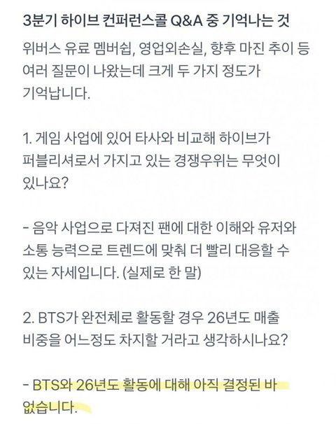 그리고 BTS가 이제 완전체로 활동할 경우에 저희 어떤 매출 비중이 될지를 여쭤보셨는데요. 아직은 저희가 멤버분들하고 2026년도 활동에 대한 논의를 하고 있는 중 따라서 프로젝션이 지금 만들어져 있지는 않습니다. 당연히 완전체로 컴백하시게 되는 경우 상당한 매출이 나오겠지만 그와 동시에 저희들의 타 아티스트들 신사업의 성장이 동반되기 때문에 매출 비중이 과거처럼 높아지지는 않을 것으로 기대하고 있습니다