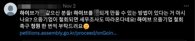 (MHN스포츠 이준 기자) '하이브의 으뜸기업 선정 취소 촉구에 관한 청원'이 동의수 4만 명을 돌파했다. 일부 아이돌 팬층은 "X되게 할 수 있다"라는 등 하이브에 대한 처벌을 위해 청원을 호소하고 있다.