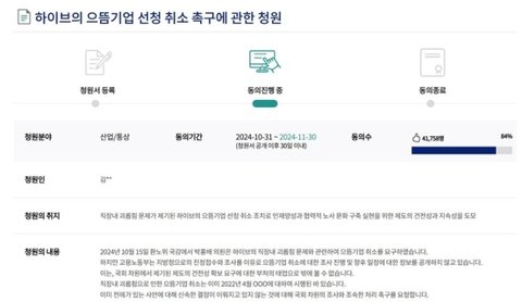 지난 10월 31일 국회 국민동의 청원에 올라온 '하이브의 으뜸기업 선정 취소 촉구에 관한 청원'