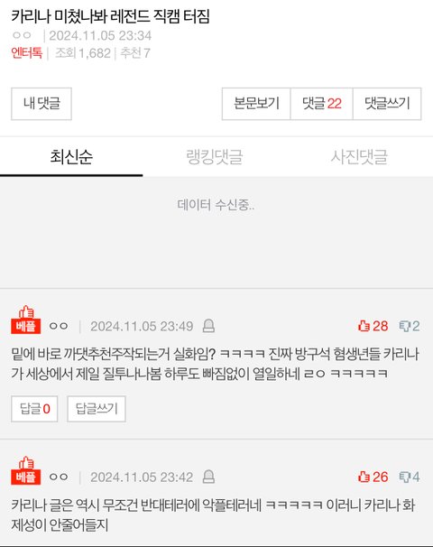 근데 지난 몇 시간 에스파 관련 글 관찰을 해 보니까 댓글 조작이 분명히 있고 악플 위주고 뉴진스 민희진 옹호 하느라 내가 싸울때 너무 많이 봤던 패턴이었어