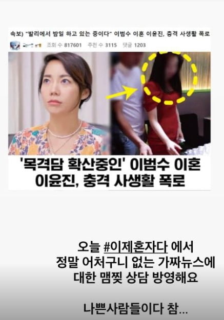 /사진=이윤진 인스타그램 캡처이윤진은 "TV조선 '이제 혼자다'에서 정말 어처구니없는 가짜뉴스에 대한 '맴찢'(마음 찢어지는) 상담을 방영한다"며 "나쁜 사람들이다, 참"이라며 가짜뉴스에 대한 심경을 드러냈다.