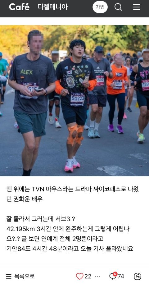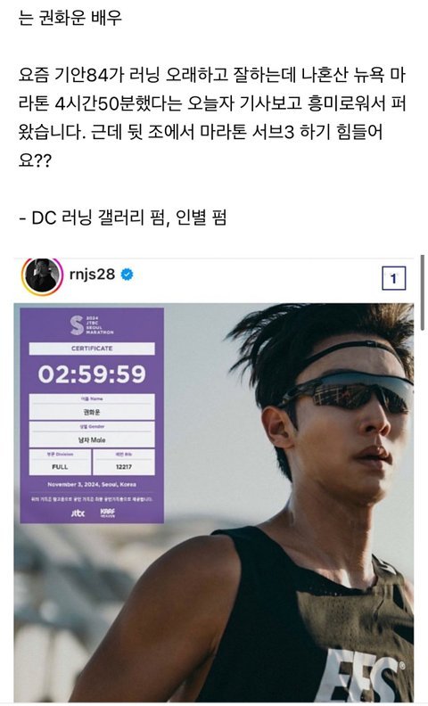 러닝 시작 6개월 만에 첫 풀 마라톤 JTBC 마라톤 맨 뒷 조에서 서브3 한 배우 권화운