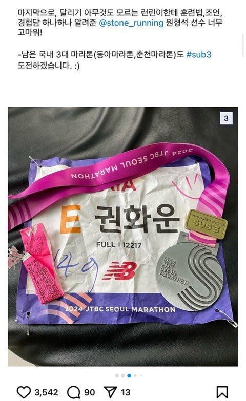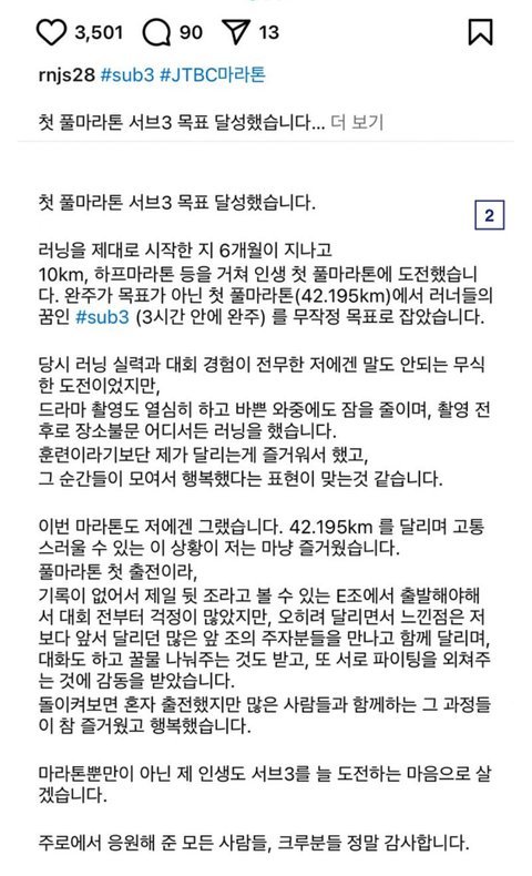 (펌)러닝 시작 6개월만에 첫 풀 마라톤 JTBC 마라톤 맨 뒷 조에서 서브3 한 배우
