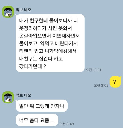 니침대옆에 친구지인이 자고있는거 보고도 괜찮다고 한번더 다시 잠든거봨ㅋㅋㅋㅋㅋㅋㅋㅋㅋ그래놓고 ㄱㄱ당한거같다 ㅇㅈㄹ;;;니몸 니가간수해