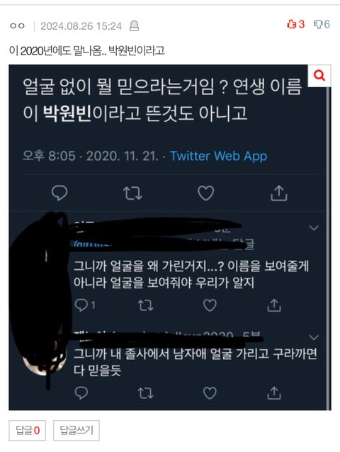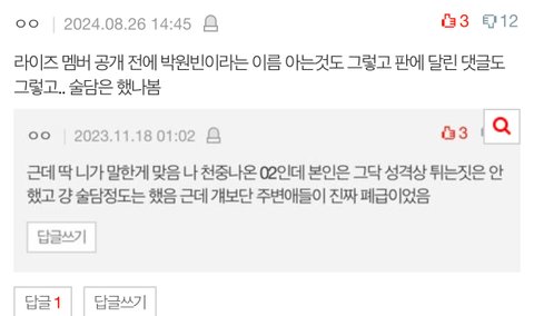 내 댓글 왜 삭제해 ㅠㅠㅠㅠㅠㅠㅠㅠㅠㅠ 너 타싸도 하는 원빈 정병이여서 나 타싸에서 질문했는데 계속 먹금 당했는데 이제 여기서도 질문해야겠다 너 여러 커뮤 돌면서 원빈 글 싸지르는 원빈 정병이잖아 그런데 에셈 고소 공지 뜨고 판 글 다 지웠짆아 난 고소같은거 안무서워하는줄 알았는데 글 지워진거 보고 고소 무섭나보네 했는데 다시 정병짓 시작한 이유 머야? 고소가 무서운거면 다시 정병짓 안할거고 고소가 안무서운거였으면 그 많은 정병글들 삭제 안했을텐데 왜 고소공지 뜨고 글 다 밀어놓고 다시 정병 짓 해? 나 이거 넘 궁금해서 타싸에서도 너가 최근에 글 올릴때마다 댓글 달았는데 조카 무시당해서 답변 달릴때까지 물어볼래 최근 좀 바빠서 못왔는데 다시 생각나서 와보니 여전히 정병짓하고 있네 하나라도 댓글 좀 달아줄래?