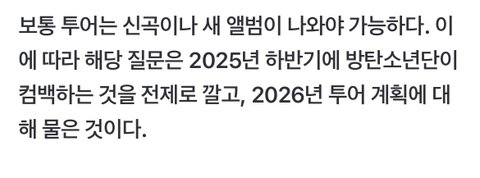 애초에 답변을 잘했으면 됐을 일임 아니 한두번 해보는 것도 아니고 대체 왜 말 한마디를 제대로 못해가지고 어휴ㅋㅋㅋ 걍 현재 대다수의 멤버가 군복무중인 상태고 26년 투어나 다른 기타 활동에 관한 구체적인 일정은 멤버들과 상의 중에 있다 계획이 좀 더 구체화되면 그때 다시 말씀드리겠다 했으면 됐잖아 진심 욕을 안할 수가 없다니까
