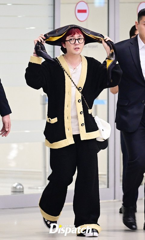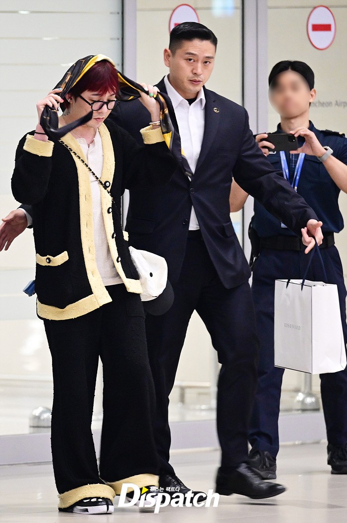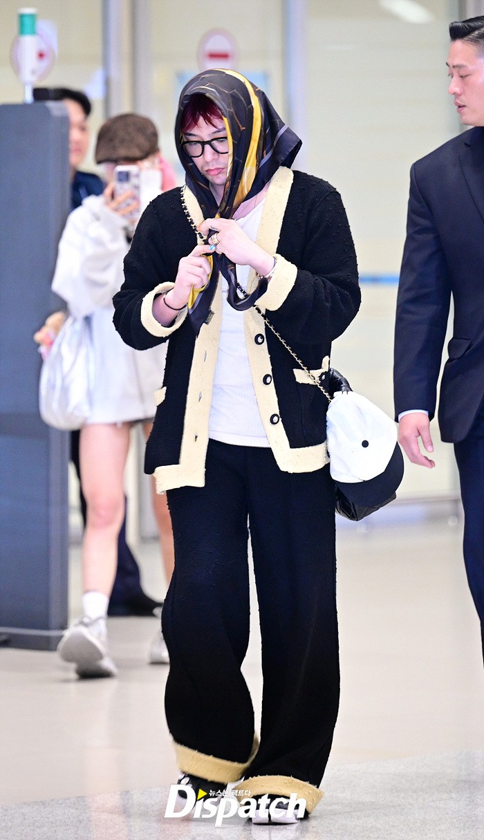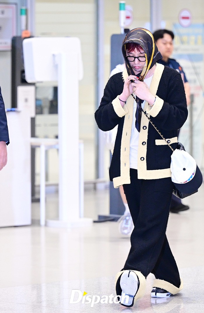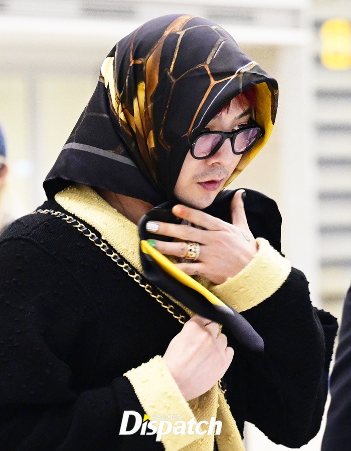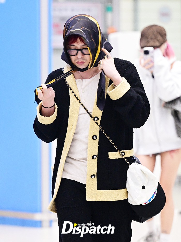 지드래곤은 스카프를 머리에 두른 채 입국장을 나섰다. 블랙 컬러의 가디건과 와이드진으로 연출한 세련된 공항패션도 돋보였다.