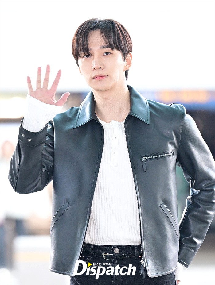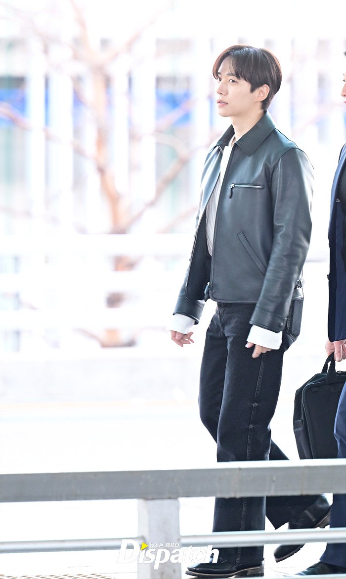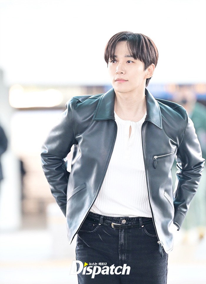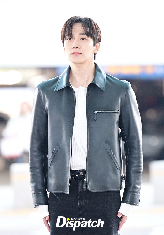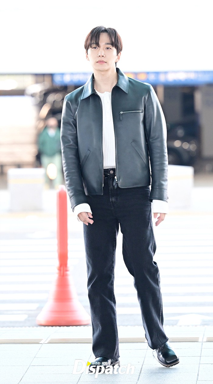 이준호는 가죽재킷과 블랙진으로 시크한 공항패션을 완성했다. 훈훈한 비주얼과 완벽한 피지컬도 눈길을 끌었다.
