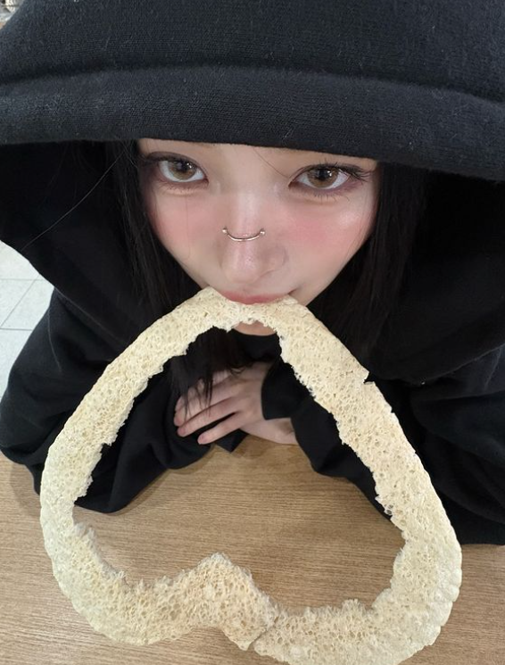 독보적인 미모를 자랑한 카리나는 이어진 사진에서 하트 모양의 뻥튀기를 입에 물고 있는 누군가의 사진을 공개했다. 주인공은 다름아닌 그룹 ITZY(있지) 멤버 류진이었다. 두 사람의 훈훈한 친목이 눈에 띈다.