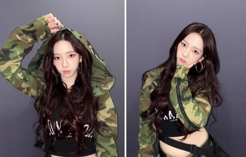 사진 속 카리나는 긴 웨이브 헤어에 커다란 링 귀걸이를 한 채 카모 무늬 후드를 입고 카메라를 응시하고 있다.