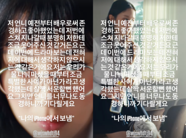 공개된 영상에서는 비비와 함께 전종서가 연기 중인 모습이 담겨 있고, 비비는 해당 영상 위에 “저 언니 예전부터 배우로써 존경하고 좋아했었는데 저번에 스쳐 지나갈 때 분명히 저한테 조금 웃어주신 것 같거든요. 그런데 이번에 드라마 보는데 전혀 저에 대해서 생각하지 않으시는 것 같은거에요. 저는 우리가 물 나눠마셨을 때부터 조금 특별한 사이가 아닌가라고 생각했는데 살짝 서운할 뻔 했어요. 그치만 언니를 너무나도 동경하니까 기다릴께요”라고 전했다.