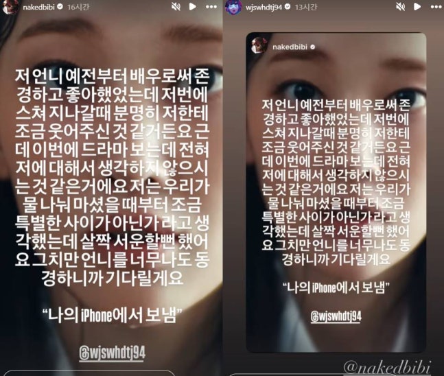 전종서와 비비는 이전에도 친분을 드러낸 바 있다. 지난 9월 전종서가 속옷 노출 사진을 올려 화제를 모았을 당시, 비비의 '비누' 가사인 "저X 저거 상했다 머릿속에 어떤 것이 들어있는지 모르겠다"를 적어 올린 것.