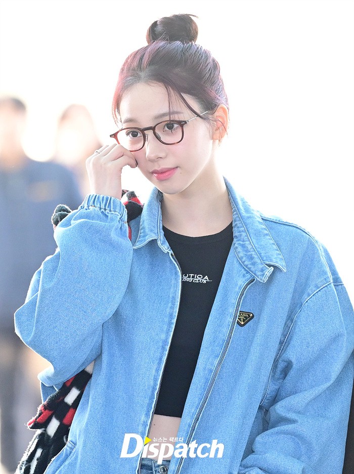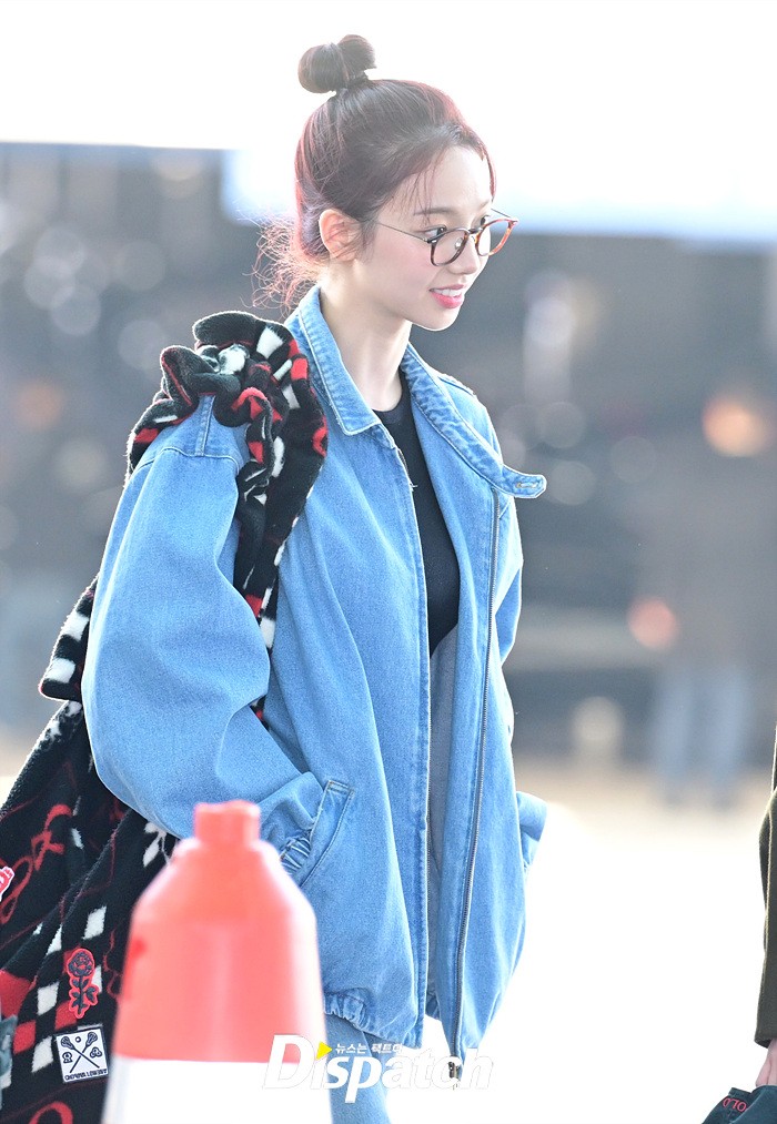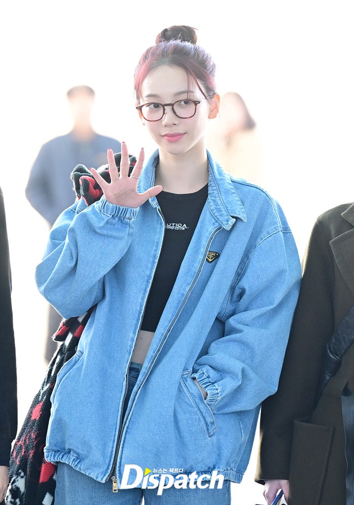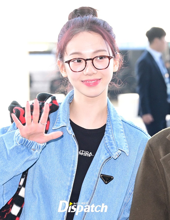 카리나는 인형같은 이목구비로 눈길을 끌었다. 데님재킷과 뿔테안경, 블랙 크롭톱으로 연출한 산뜻한 공항패션도 돋보였다.