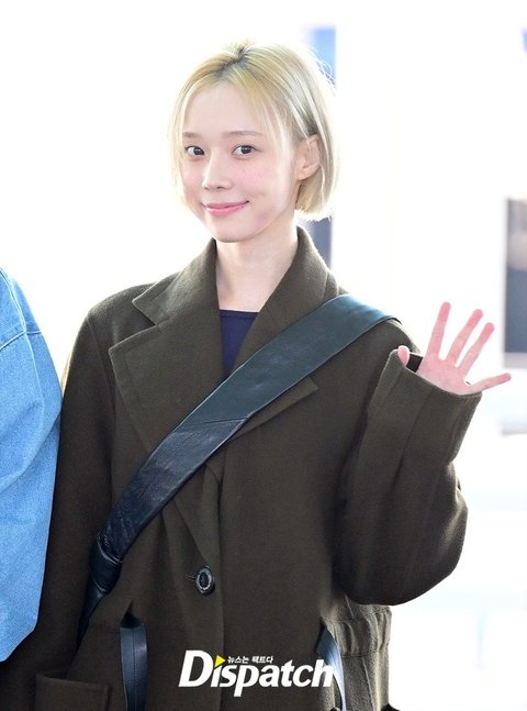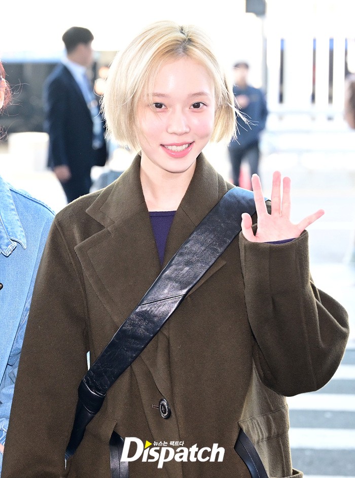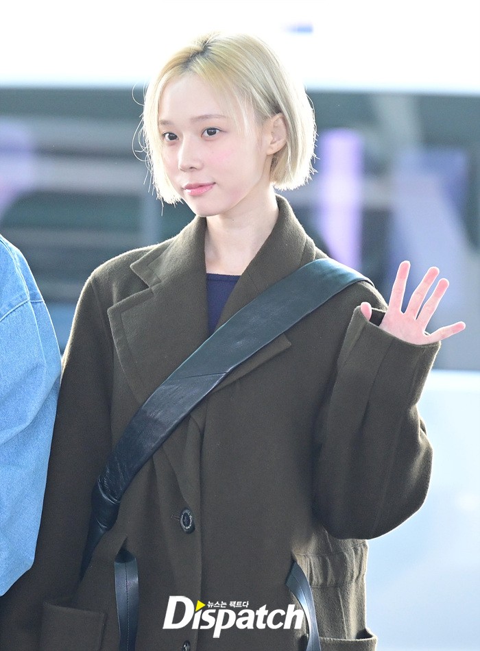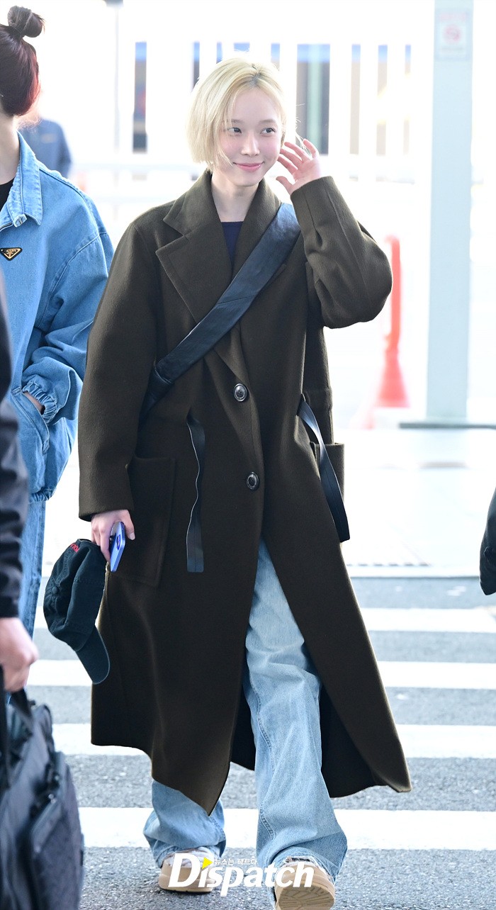 윈터는 러블리한 금발헤어와 요정같은 비주얼로 시선을 사로 잡았다. 공항에 모인 팬들을 위해 환한 손인사로 화답했다.