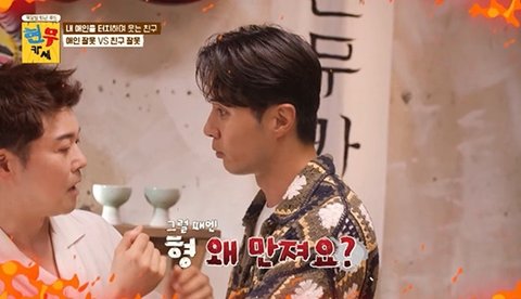 급기야 그는 "네 여자친구가 웃겨서 때린 거다"라는 전현무에게 "어, 어? 지금 상체, 하체 다 때렸다. 난 너무 불쾌하다. 나라면 '형 왜 만져요' 할 거다. 내 여자친구를 왜 만져"라고 분노를 폭발했다.