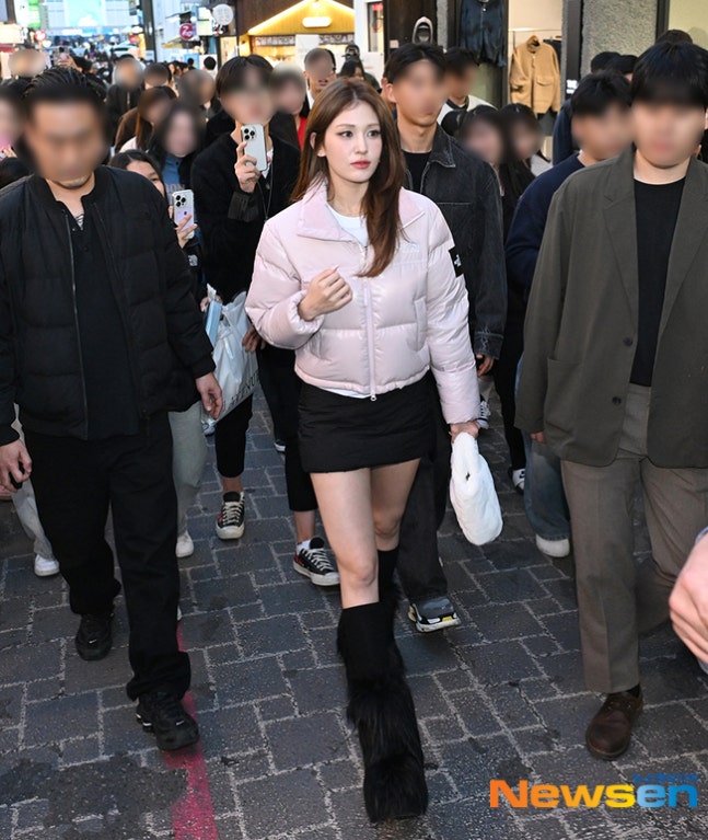 이날 전소미는 파스텔톤 핑크색 숏패딩에 검은색 미니스커트를 입고 니삭스에 털 부츠로 캐주얼하면서도 개성이 드러나는 패션을 선보였다.