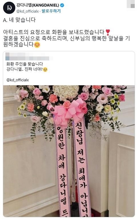 강다니엘 팬싸 간 팬이 최애랑 결혼하는 게 꿈이었는데 실패해서