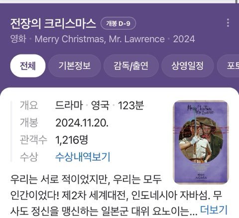 우선 영화 <전장의 크리스마스> 는 1983년 상영된 영화로 제 2차 세계대전을 소재로 만들어진 영화입니다.
