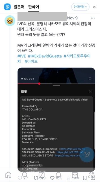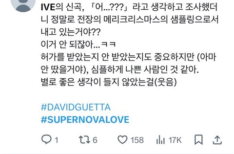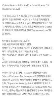얼마전 발매한 아이브의 supernovalove 는 THE COLLAB X 의 프로젝트 콜라보곡으로 'Hey mamm', 'Titanium' 등으로 유명한 DJ 이자 프로듀서인 데이비드 게타와 아이브가 참여한 동.서양 음악교량 프로젝트로 故 류이치 사카모토님의 'Merry christmas mr. lawrence' 를 샘플링으로 사용하였습니다. 이와 관련해 현재 유튜브와 많은 커뮤니티에 오해의 소지가 있는 댓글이 많아 조금이나마 오해를 풀고자 글을 남깁니다. (스압주의 양해부탁드려요)