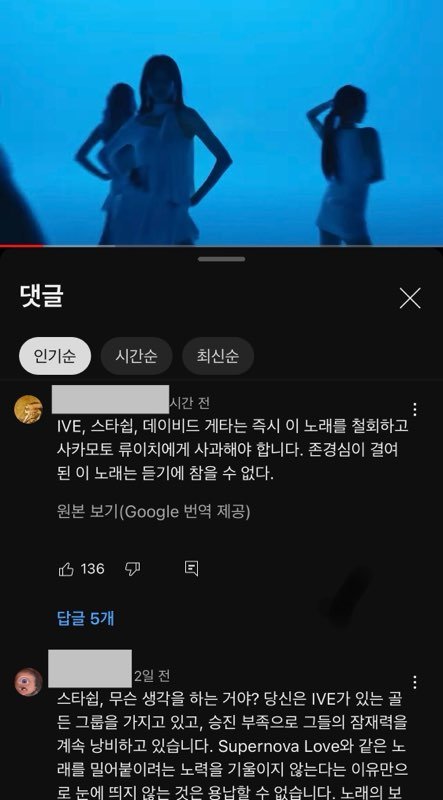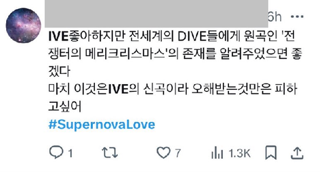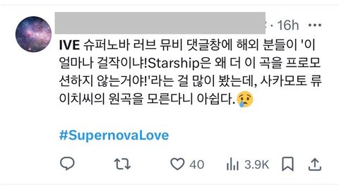 에스파의 supernova 곡이 워낙 유명한 노래고 최근에 발매한 노래기 때문에 따라했다는 의견이 많은데 에스파님의 SUPERNOVA 는 5월말 발매되었고 아이브의 SUPERNOVALOVE 는 해외투어중인 6월에 이미 뉴욕에서 MV를 촬영한 곡입니다. 외국 제작사의 프로젝트곡으로 샘플링 및 노래를 제작하는데 많은 시간이 소요되며 이미 녹음까지한 곡을 엎을 수는 없는 상황이었을겁니다.