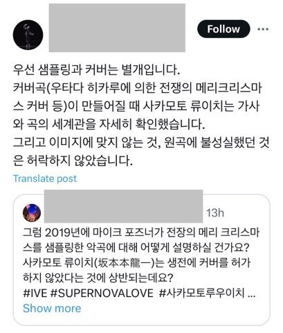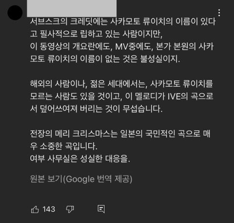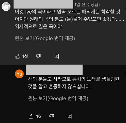 또한 이 곡은 이미 여러번 샘플링이 된곡으로 대표적인 곡은 일본가수인 우타다 히카루의 Merry christmas mr. lawrence FIY' 인데 이 곡은 되고 아이브는 원곡을 망쳤다 라는 그들의 논리는 납득하기 어렵네요.. 조금만 검색해봐도 알 수 있는 정보인데 지나친 억측은 삼가해주셨으면 좋겠습니다.
