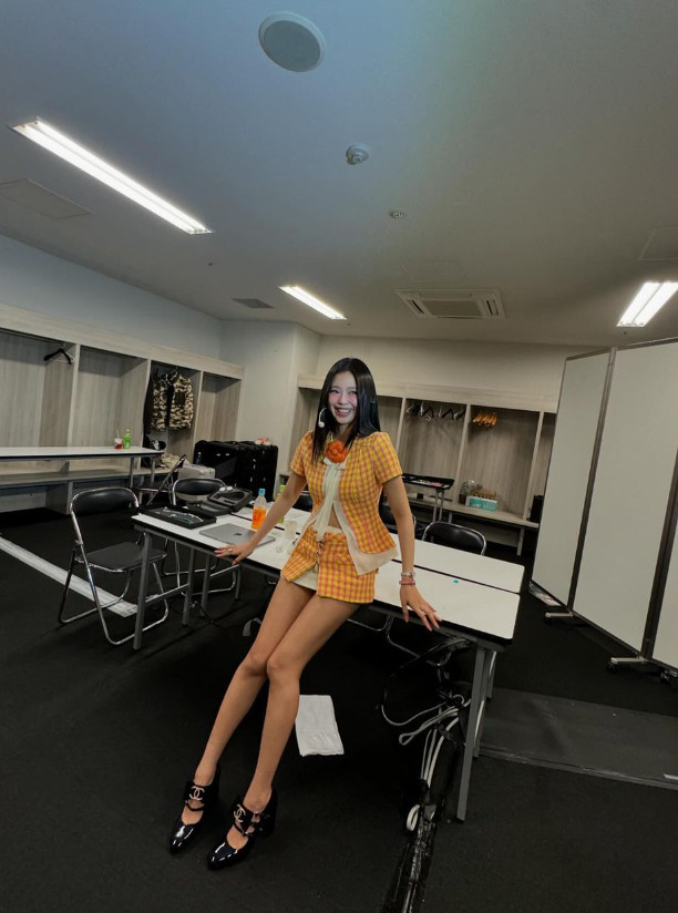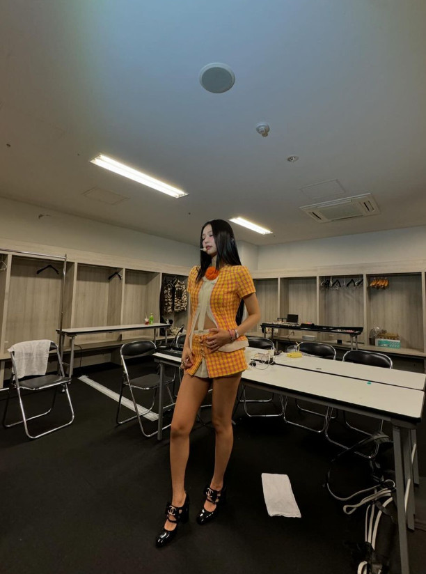 제니 소셜미디어노란색, 핑크색 스트라이프가 교차하는 밝은 톤의 셋업 의상을 입은 제니는 더욱 상큼한 비주얼로 눈길을 끈다. 배가 드러나는 트임 포인트에, 치마 두 개를 겹친 듯한 초미니 스커트로 날씬하고 긴 다리를 뽐냈다. 여기에 샤넬 로고가 선명한 하이힐을 신어 고급스러운 무대 의상을 완성했다.